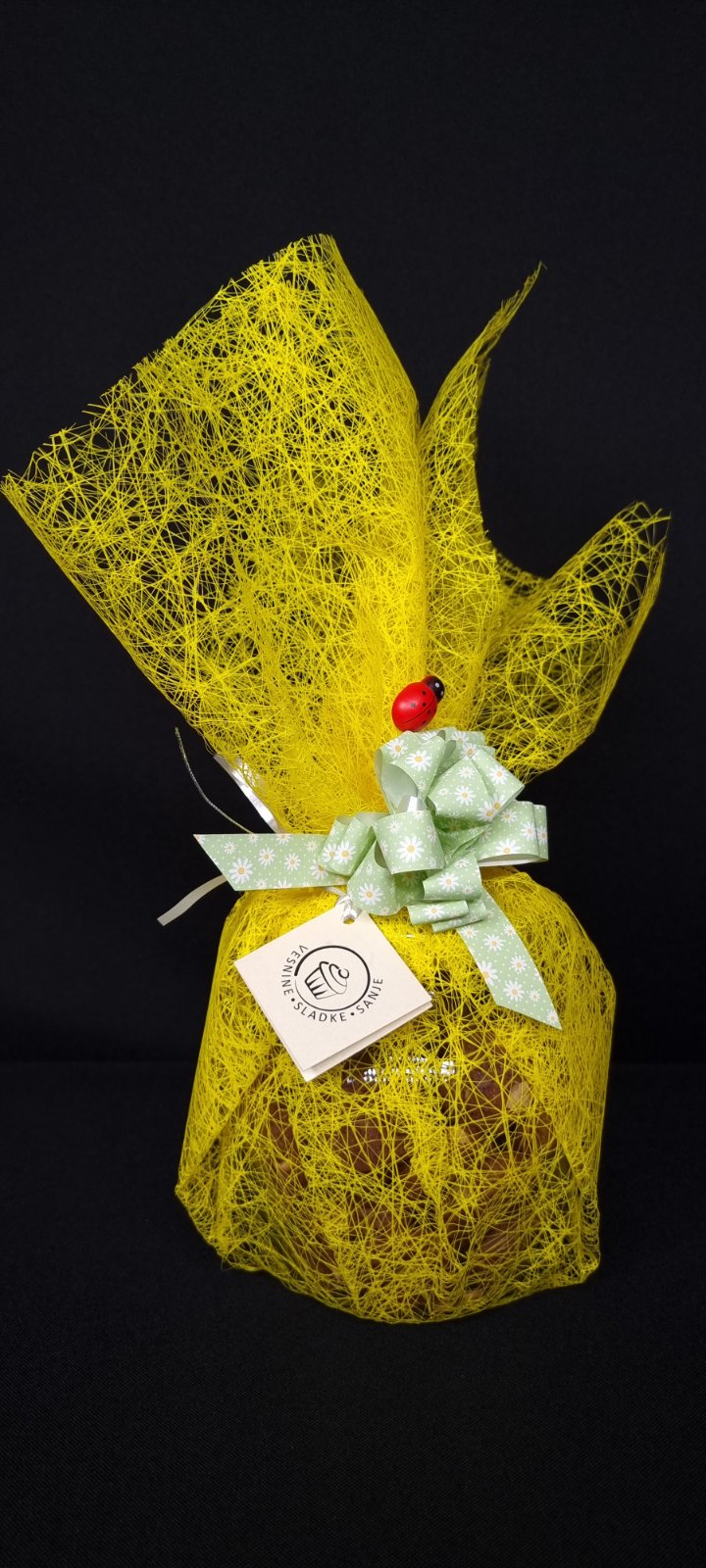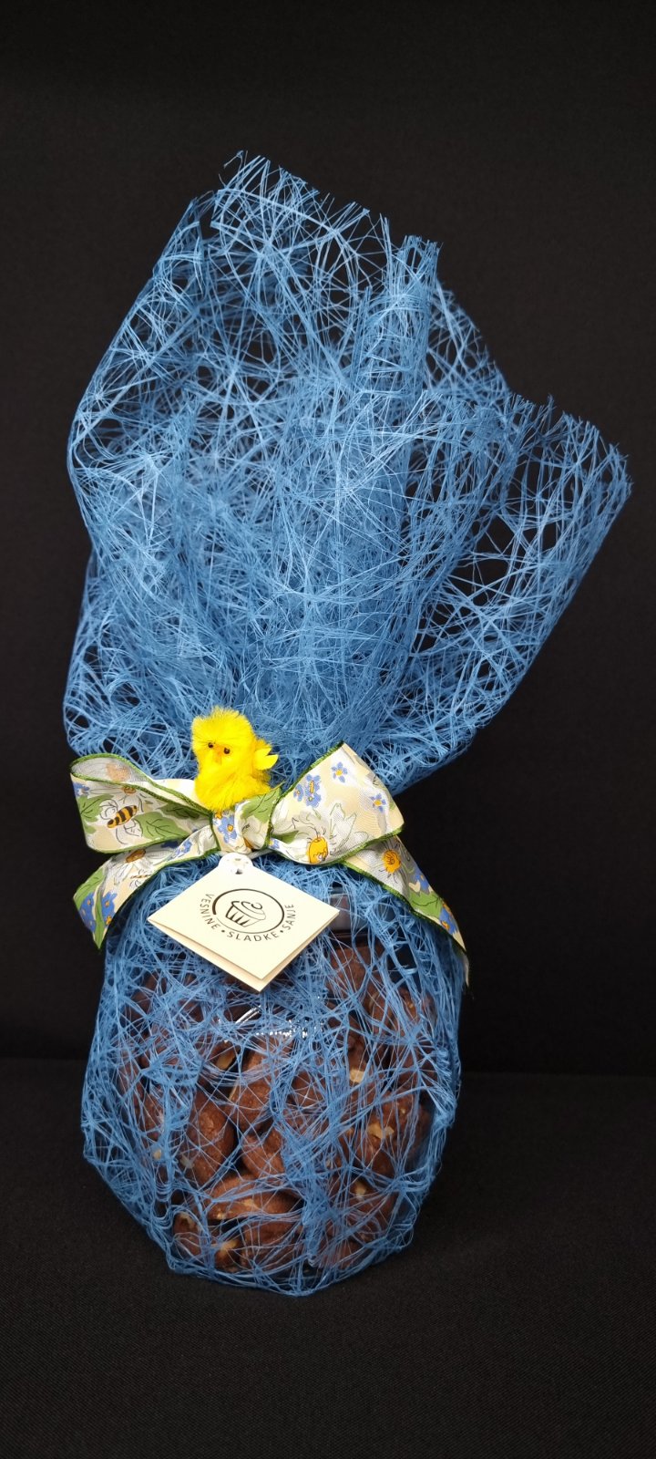 Velikonočni piškotni pirhi oviti v nesvetleč materijal z mrežo.