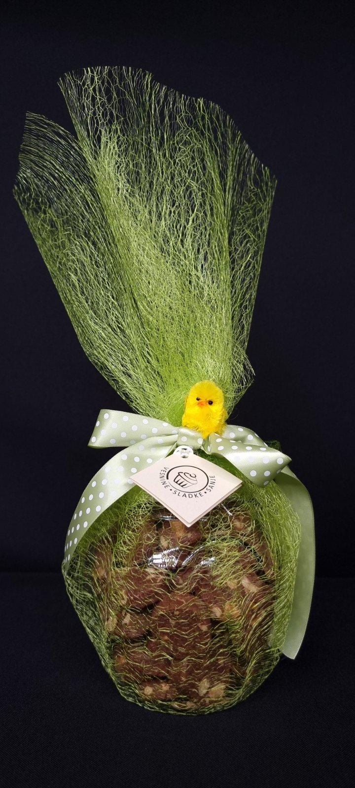 Velikonočni piškotni pirhi oviti v svetleč materijal z vlakni.