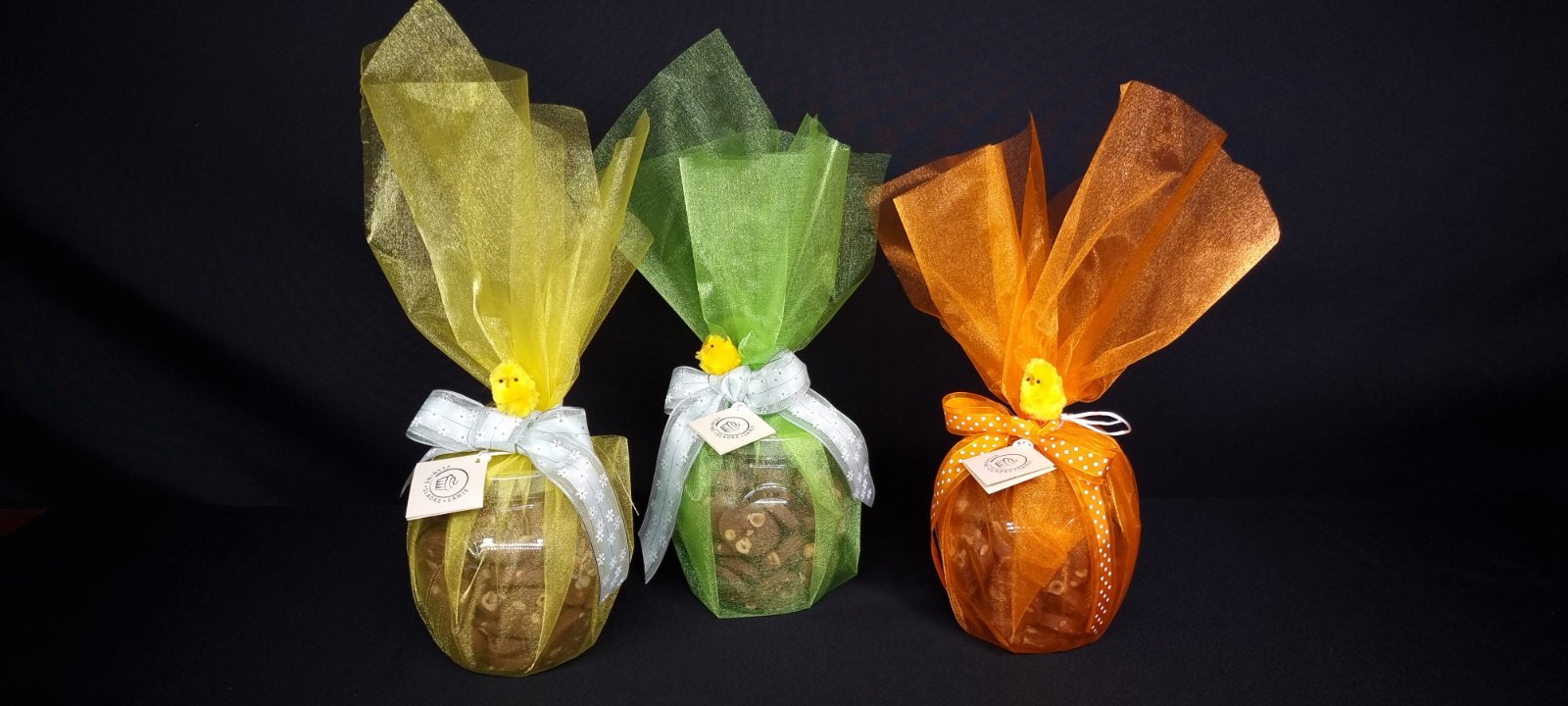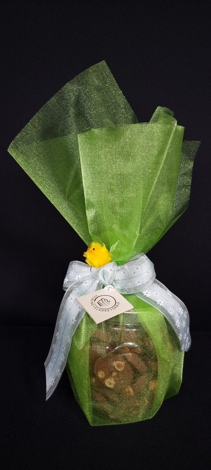 Velikonočni piškotni pirhi oviti v svetleč materijal.
